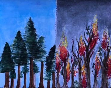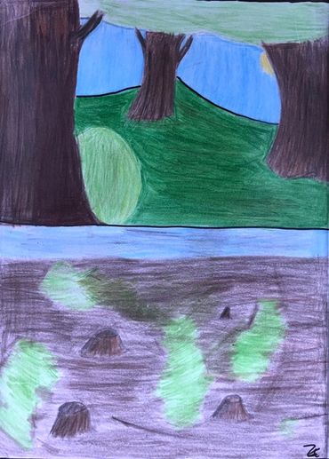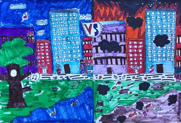 This picture shows a contrast between the industrial world and the natural world through the stroke of a paintbrush. I drew the paintbrush to awaken people's awareness that we can make the change, and it is never too late to change and make the world green again.